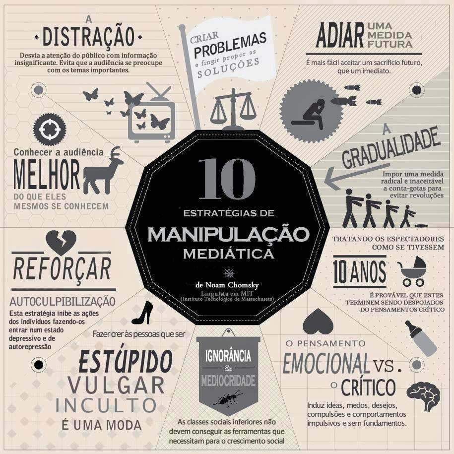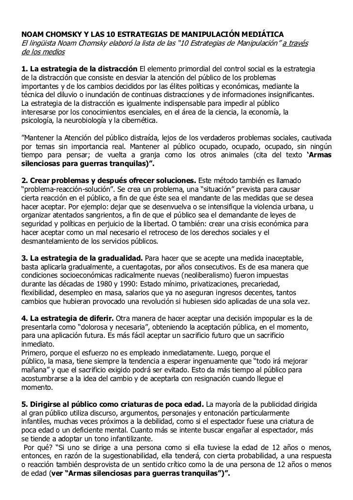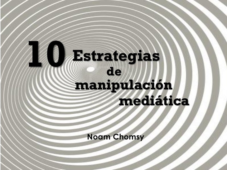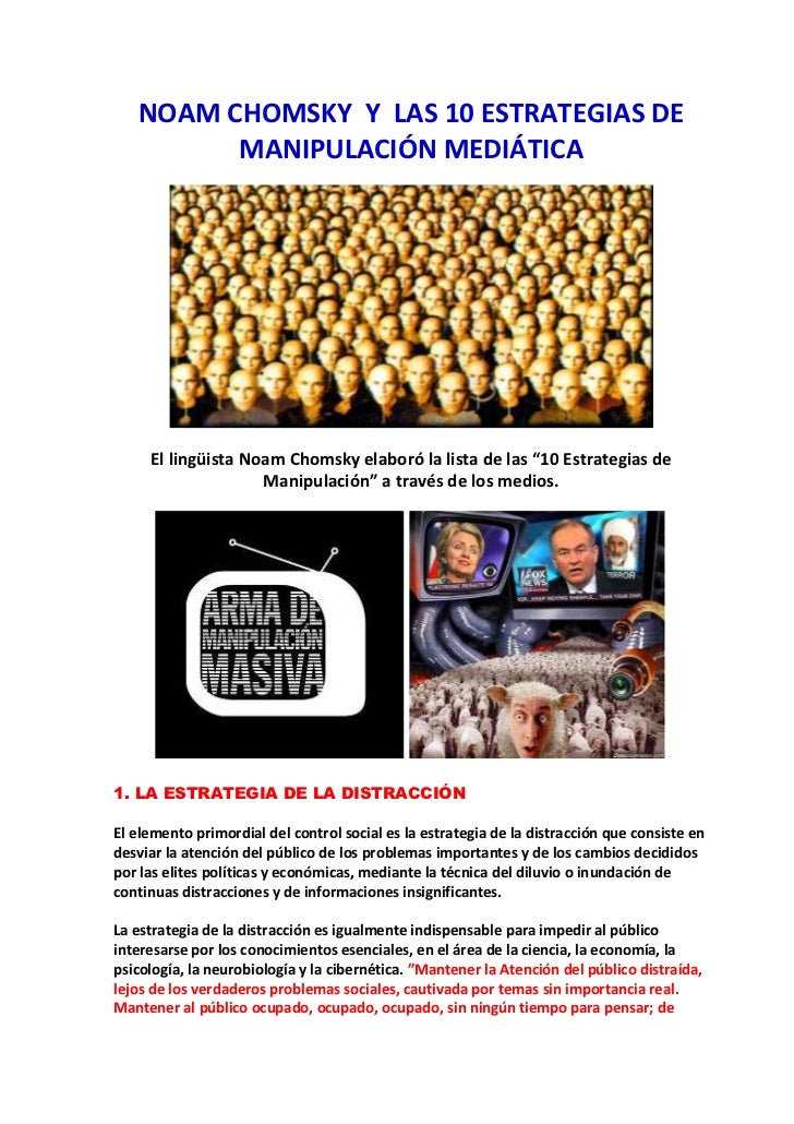 Las 10 Estrategias de Manipulación Mediática - Noam Chomsky. El lingüista Noam Chomsky elaboró la lista de las "10 Estrategias de Manipulación" a través de los medios . 1. La estrategia de la distracción. El elemento primordial del control social es la estrategia de la distracción que consiste en desviar la atención del público de.