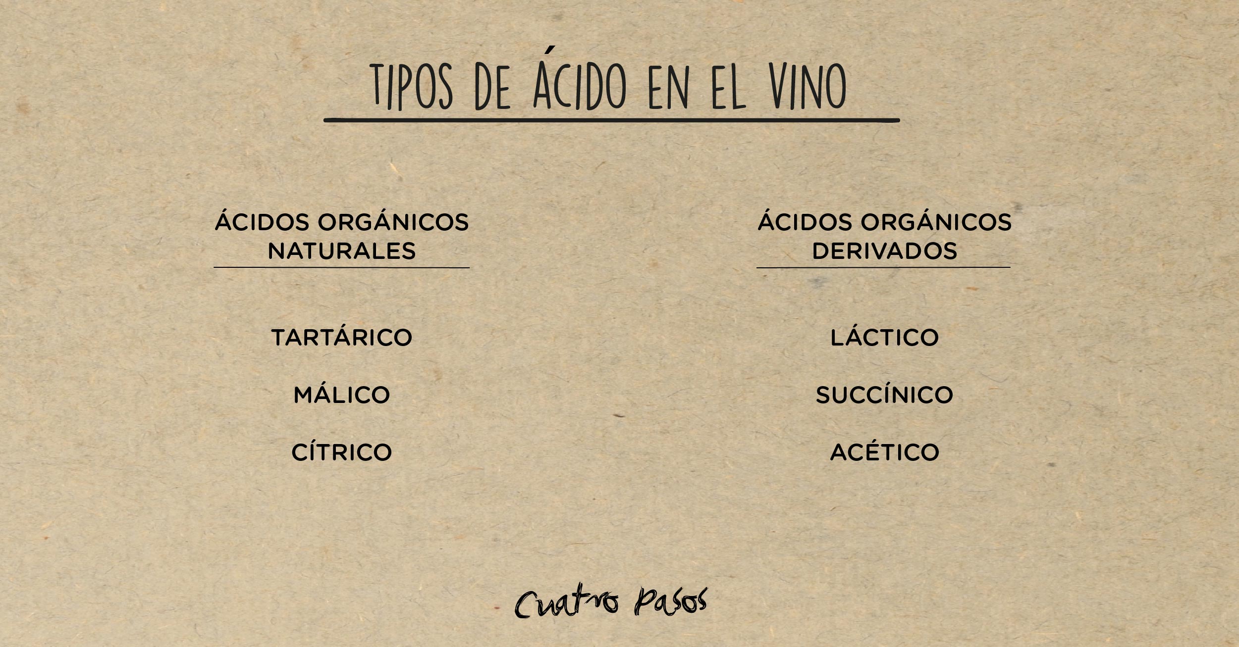 Los ácidos naturales mayoritarios en la uva son el ácido málico y el ácido tartárico, entre ambos suman más del 90% del total, aunque también hay otros en menores cantidades, como el ácido cítrico, que juegan un papel menos relevante en el vino. La suma de todos los ácidos derivados de la uva, como el málico, tartárico, cítrico y.