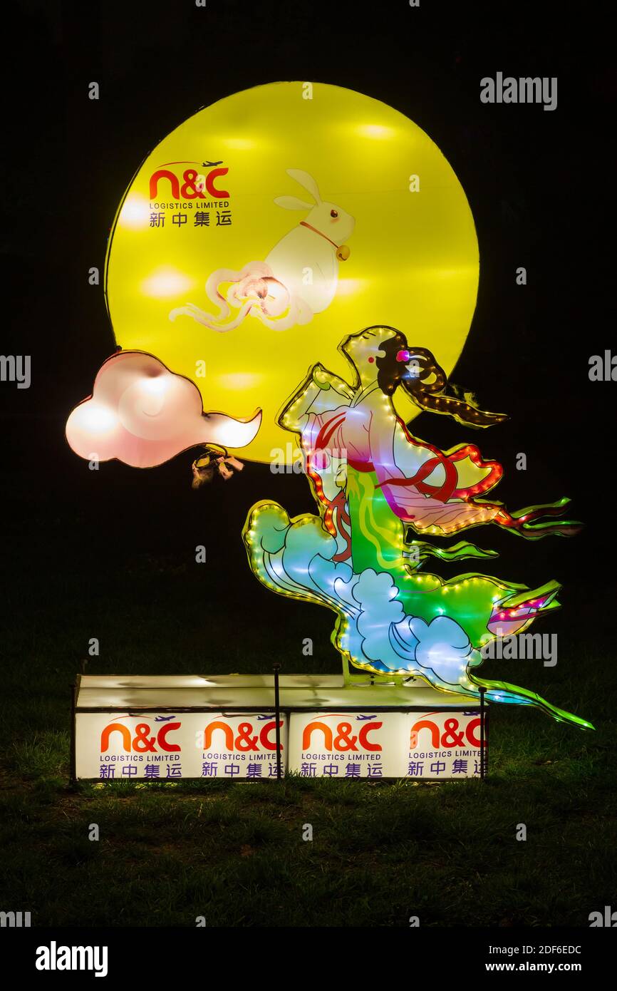 Una escultura iluminada de la diosa de la luna China Chang'e con la luna y un conejo Fotografía