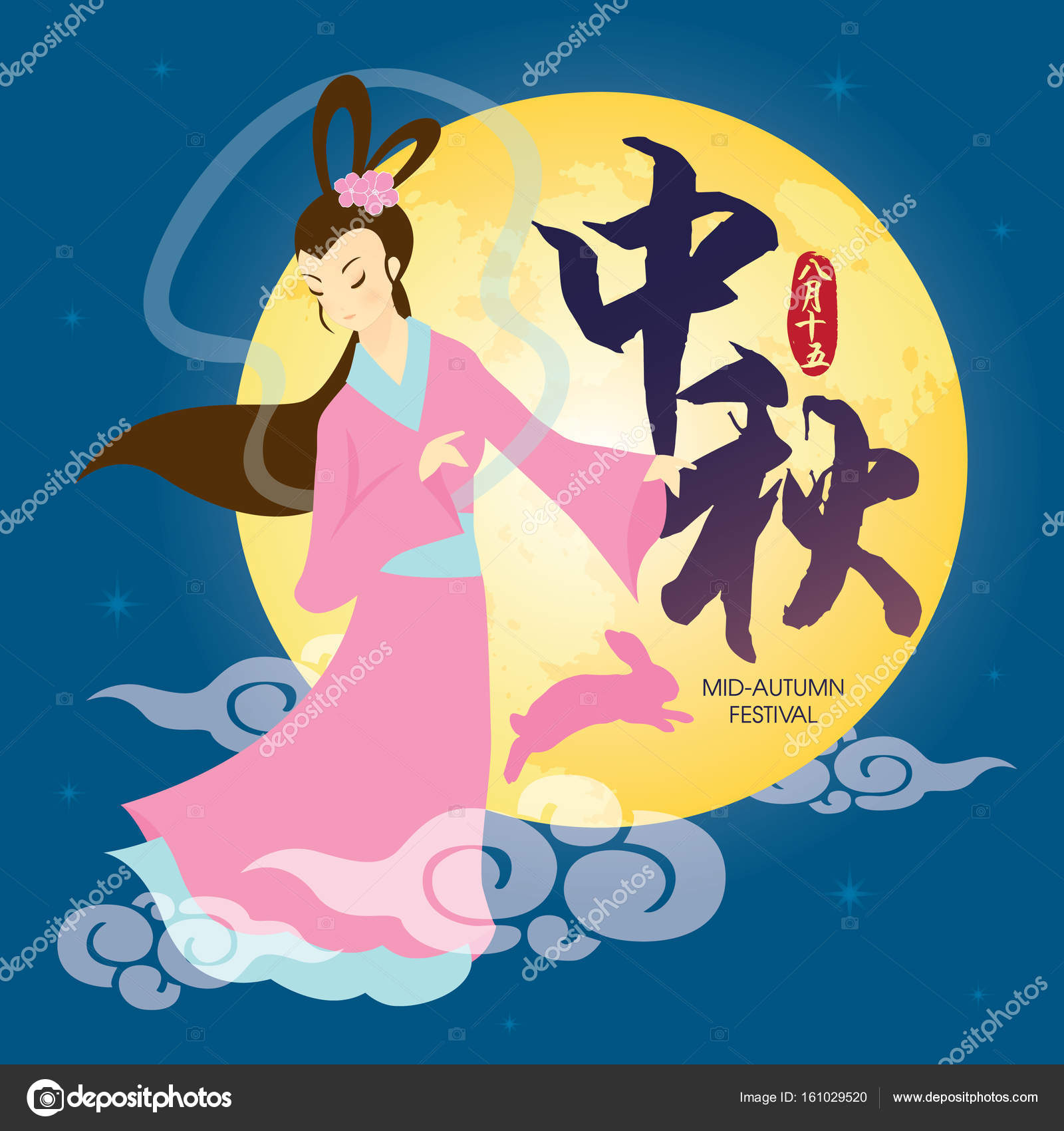 Ilustración del festival de mediados de otoño de Chang 'e (diosa de la luna) y conejito con luna
