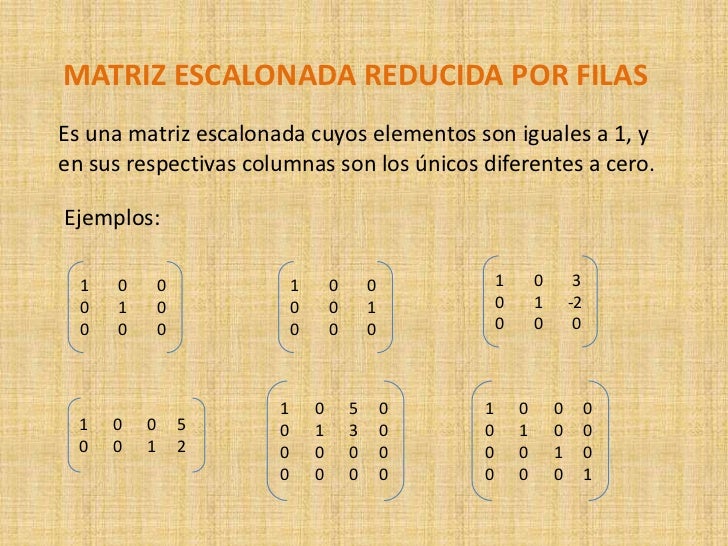 Introducción. En esta entrada tratamos la forma escalonada reducida de una matriz, que es básicamente una forma «bonita» de expresar una matriz que nos permite resolver sistemas de ecuaciones lineales.Luego nos adentramos en la parte de operaciones elementales, que es el primer paso para desarrollar un algoritmo (que luego veremos es la reducción gaussiana) que nos permite llevar a.