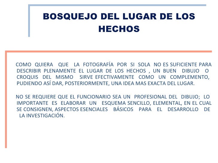 Se realizará un croquis del lugar de los hechos; se trata de un dibu-jo a mano alzada del lugar del delito, sin escalas de referencia y que servirá para la confección del plano, que se confeccionará fuera de la escena; éste consiste en un dibujo a escala del lugar Finalmente, se anotará toda la actuación llevada a cabo por los agentes.