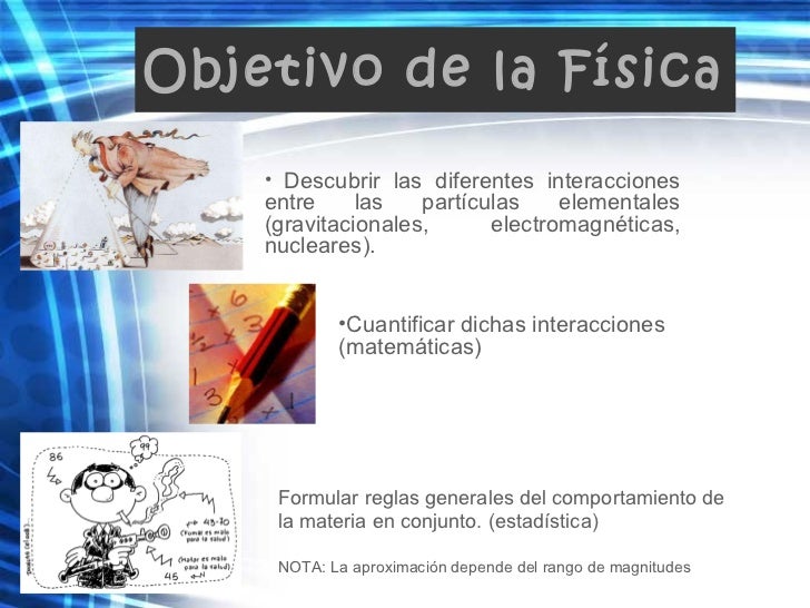 El objetivo de la física es comprender cómo funciona el mundo que nos rodea a través del estudio de las leyes fundamentales que rigen la naturaleza. Mediante la observación, la experimentación y la formulación de teorías, los físicos intentan dar explicación a los fenómenos físicos que observamos en nuestra vida cotidiana y en el.