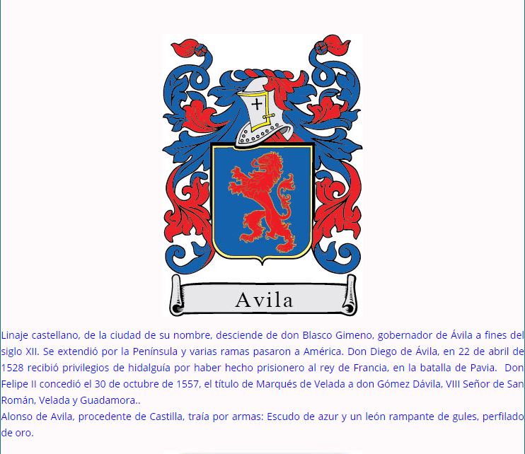 Es un apellido toponímico que hace referencia a la ciudad de Ávila. Como ocurre con muchos otros apellidos, en principio era una forma de identificar la procedencia de una persona. Escudo. Partido 1: En gules, dos estrellas en oro. 2: En plata dos lises en azur, puestas en palo.