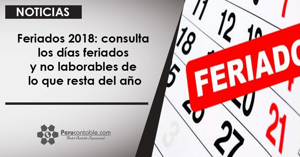 Calendario de feriados 2018 en Perú. El calendario de feriados 2018 en Perú señala que se tendrá diez días feriados no laborables en nuestro país, cinco días feriados que coinciden con fines de semana (sábado o domingo) y habrá tres fines de semana largos (cuando el feriado es en un día lunes o viernes). Cabe destacar que no todos los.