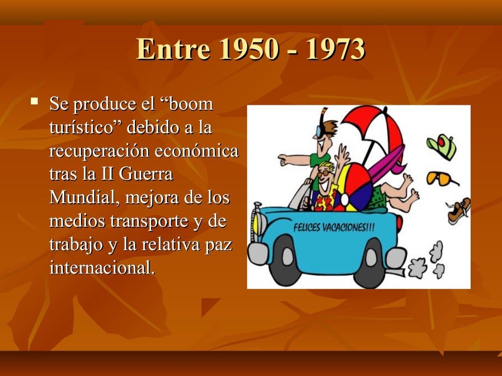 A partir de 1945, cuando acaba la Segunda Guerra Mundial, el turismo comienza a llegar a una cantidad más grande de personas. Previamente fue preciso el auge de una economía de mercado o de las.