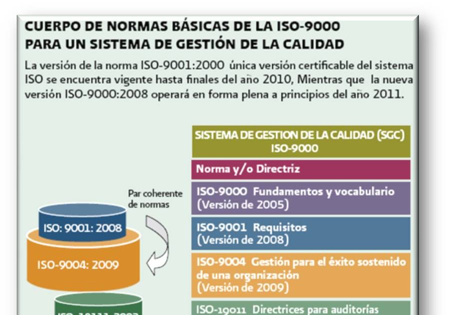 La principal norma de la familia ISO 9000 es la ISO 9001 Sistemas de Gestión de Calidad - Requisitos, misma que fue creada para asistir a las organizaciones, de todo tipo y tamaño, en la implementación y operación de sistemas eficaces de gestión de la calidad.. en el 2008 y la versión vigente 2015. La familia de ISO 9000 actualmente.