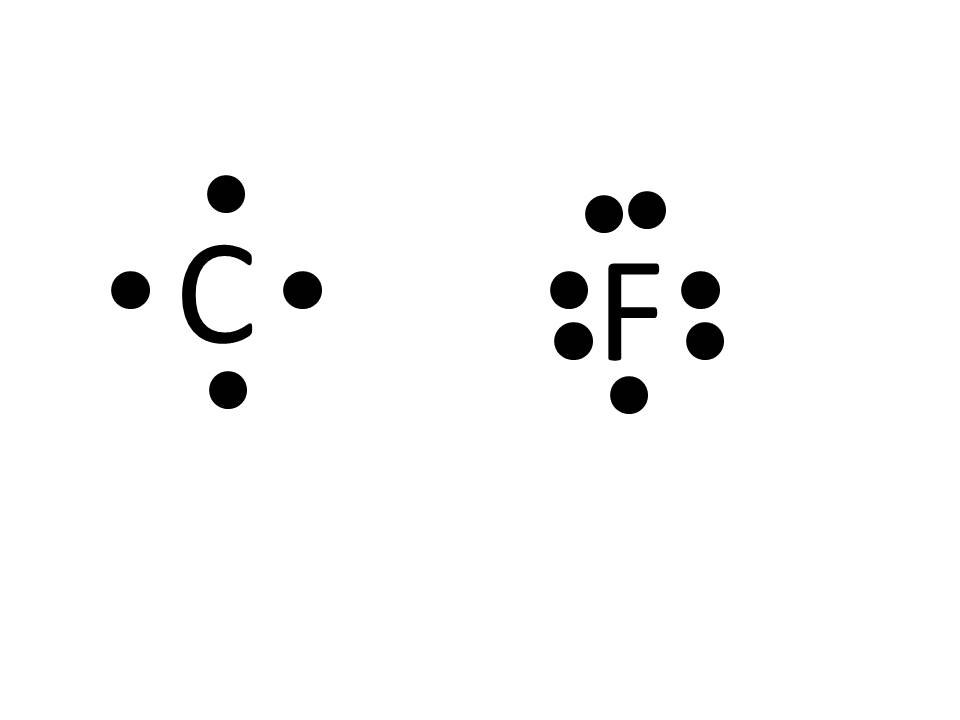 El nuevo par de electrones que se forma a partir del electrón desapareado en el flúor y el electrón simple en el hidrógeno, pensó Lewis, es el enlace que mantiene unidos a los dos átomos. Figura 4.2.2 4.2. 2: Un recuento de números de electrones en una molécula pequeña, fluoruro de hidrógeno, mostrando los electrones como puntos.