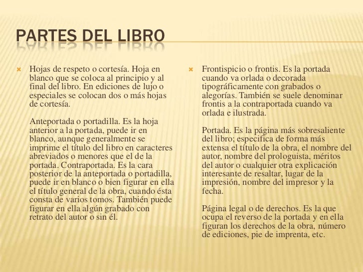 Conoce la terminología básica de las partes de un libro, tanto del exterior como del interior, para referirte a ellas como un profesional. +34 655 913 175 hola@marianaeguaras.com.. el libro. Páginas de cortesía o respeto: hoja u hojas en blanco. Colofón: anotación ubicada en la última página, en la que se detallan los datos de.