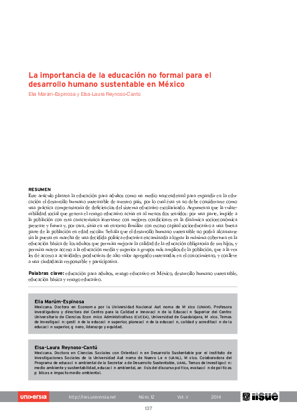 Redalyc.La importancia de la educación no formal para el desarrollo humano sustentable en México. Revista Iberoamericana de Educación Superior. E-ISSN: 2007-2872. emmaro@unam.mx. Instituto de Investigaciones sobre la Universidad y la Educación México. Marúm-Espinosa, Elia; Reynoso-Cantú, Elsa-Laura La importancia de la educación no.