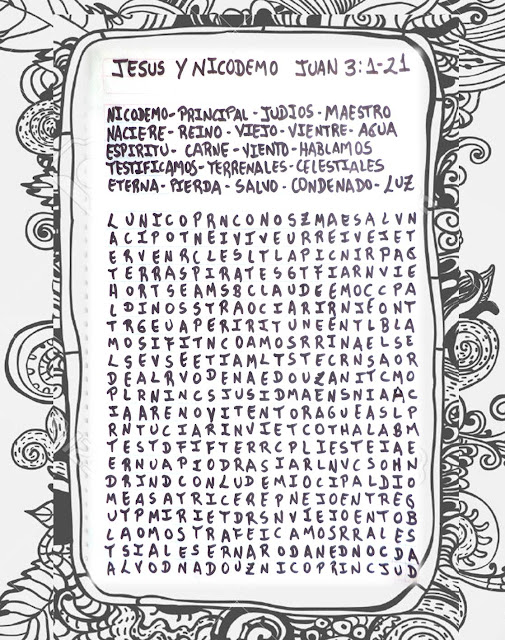 Historias Bíblicas para niños domingo, 15 de enero de 2012. Lección: Jesús y Nicodemo JESUS Y NICODEMO. 1) SOPA DE LETRAS. 2) Ordená la historia, poné el número 1 a la primera escena de la historia, así hasta llegar al número 4.. Etiquetas: Biblia, biblia niños jesús, Dios, escuela bíblica, escuela dominical, nacer, Nicodemo. 1.