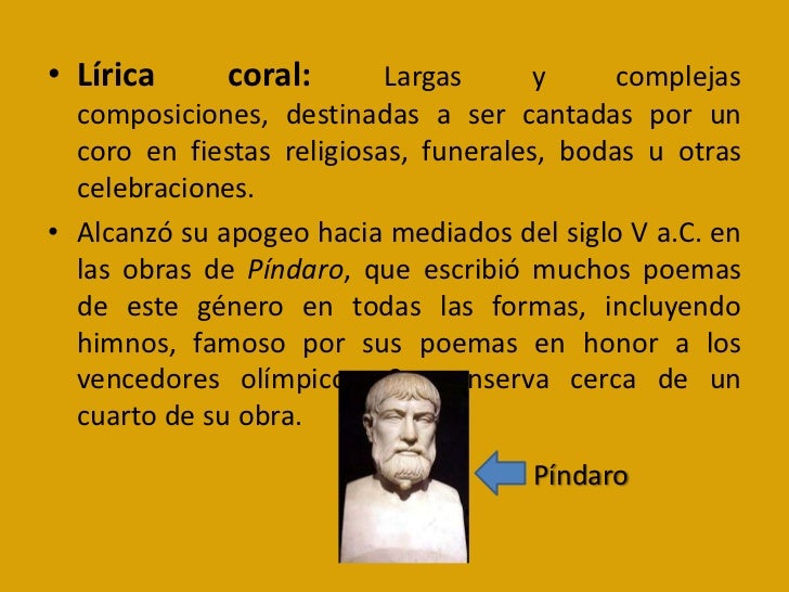 Era la lírica, en sus orígenes, una especie de poesía cantada y acompañada, de fondo, por el bello sonido de la lira. Había dos tipos, dos formas de llevar a cabo este arte: la coral, con varias voces y acompañamiento, y la monódica, a una sola voz y sin acompañamiento alguno. Alcmán, Estesícoro, Íbico y Píndaro son, seguro, nombres.