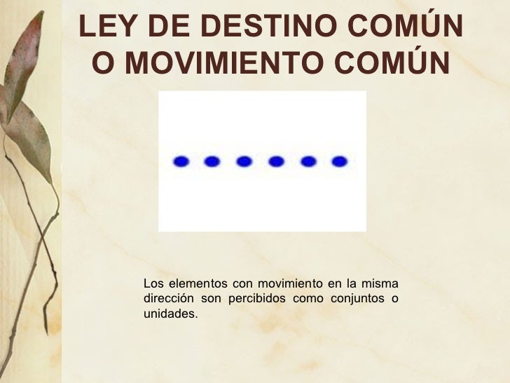 La ley del destino común se refiere a la tendencia humana a agrupar objetos que están moviéndose en la misma dirección o hacia el mismo destino final. En otras palabras, nuestra mente tiende a percibir objetos que se mueven juntos como un grupo, incluso si estos objetos no están físicamente conectados. Esta ley puede aplicarse a cualquier.