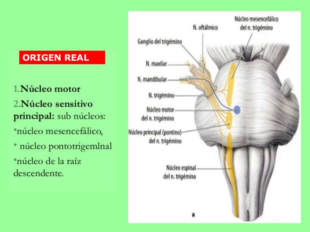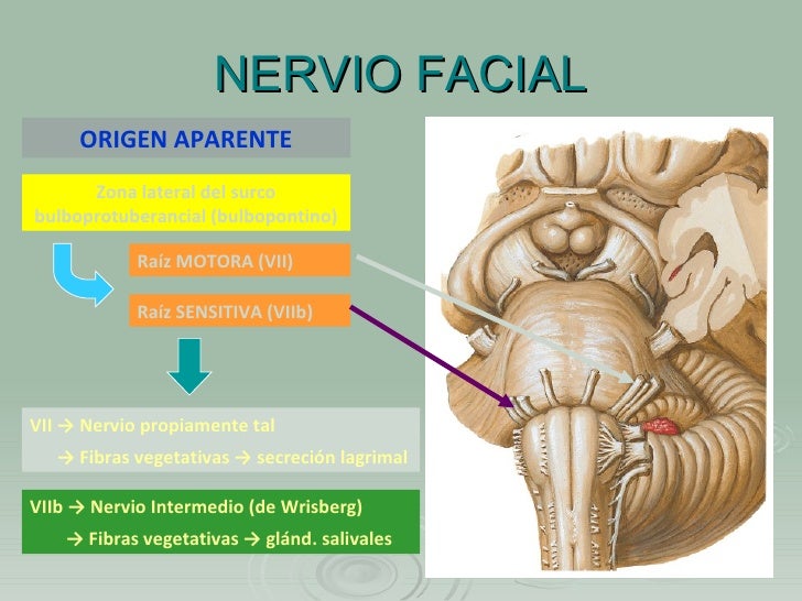 Origen real. El nervio facial consiste en dos fibras nerviosas, el nervio facial propiamente dicho y el nervio intermedio o intermediario de Wrisberg.El facial propiamente dicho tiene su origen en neuronas motoras del núcleo facial que está situado ventralmente en la porción inferior o caudal del puente troncoencefálico. [1] Los axones salen hacia atrás en dirección dorsal y medial hacia.