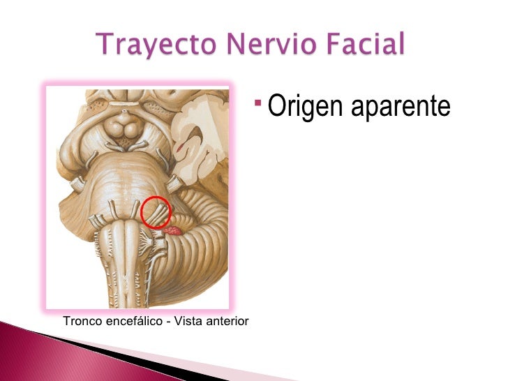 El origen aparente de este nervio está en la parte lateral del surco bulboprotuberancial. El tronco del nervio facial entra por el borde posterior de la glándula parotídea y en el espesor de la glándula da varias ramas que se unen entre sí formando el plexo intraparotideo. Al llegar al borde anterior de la glándula, salen las cinco.