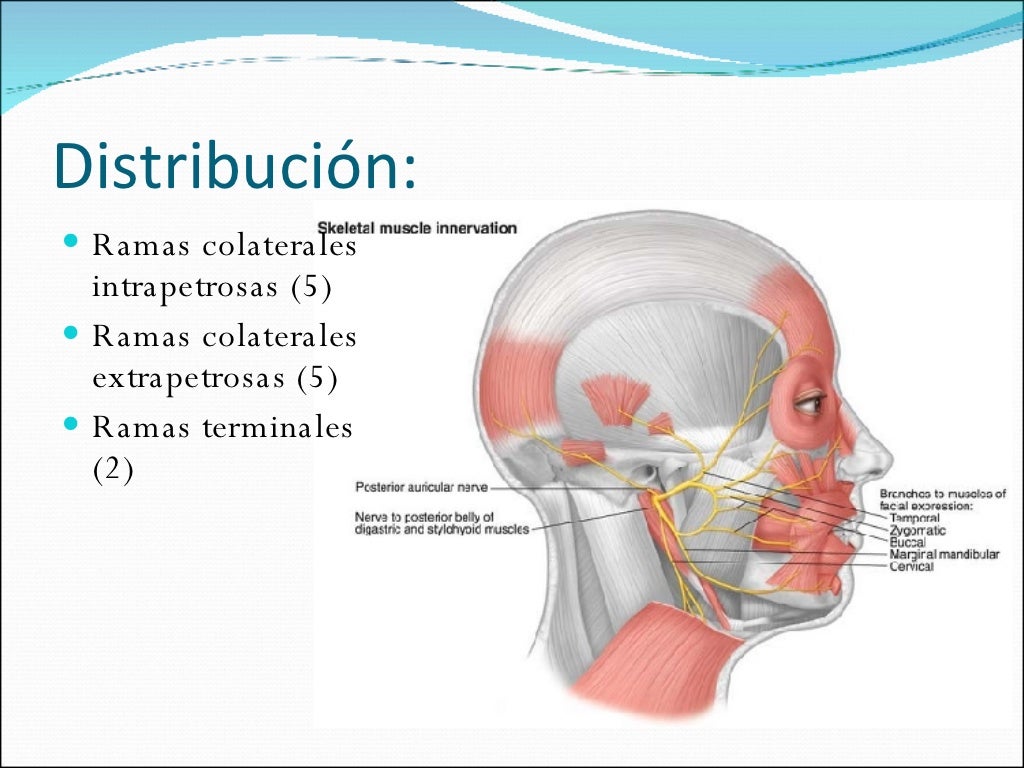 Nervio facial. El nervio facial (VII par craneal), es el séptimo nervio craneal apareado. En este artículo, se examinará el curso anatómico del nervio, y las funciones motoras, sensoriales y parasimpáticas de sus ramas terminales. El nervio facial se asocia con los derivados del segundo arco faríngeo. Motor: Inerva los músculos de la.