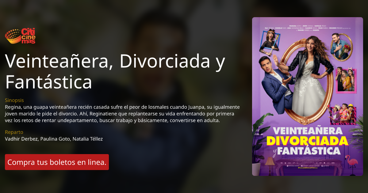 Veinteañera: Divorciada y Fantástica película dirigida por Noé Santillán-López y protagonizada por Paulina Goto, Jesús Zavala y Vadhir Derbez. Año: 2020. Sinopsis: Regina, una guapa veinteañera recién casada sufre el peor de los males cuando Juanpa, su igualmente joven marido le pide el divorcio. Ahí, Regina tiene que replantearse su vida enfrentando por prim.
