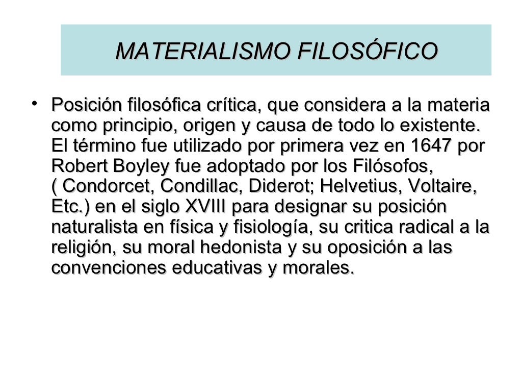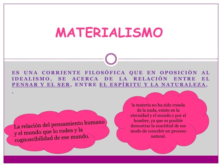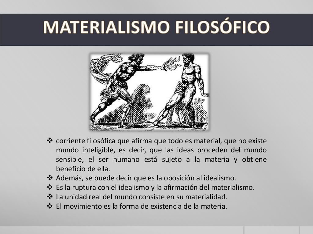 Qué es el Materialismo (y sus tipos) En filosofía, el materialismo es una corriente de pensamiento según la cual el mundo puede explicarse en función de la idea de materia, pues todas las cosas son causa de la acción de la materia y no del espíritu. La materia es así la primera realidad de las cosas, independientemente de que pueda o no.