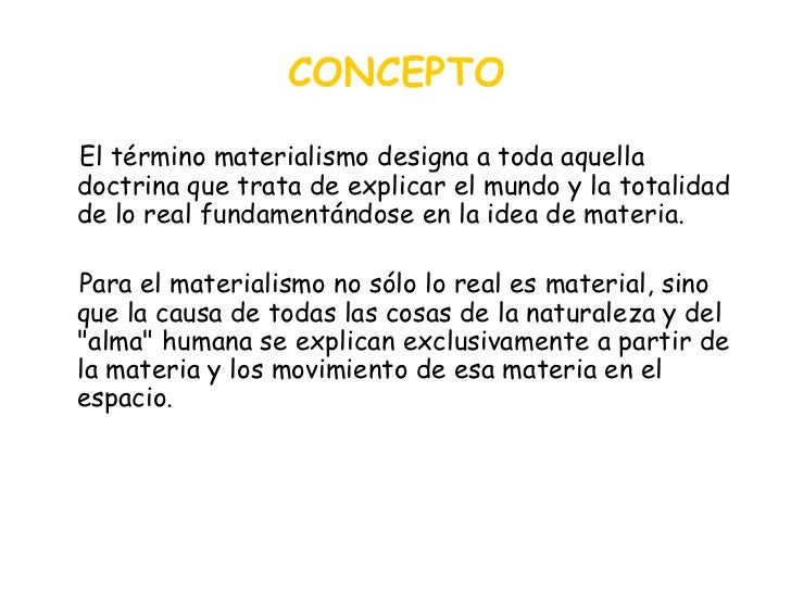 Materialismo. El Materialismo puede referirse tanto a la simple obsesión con mundo material, en contraposición a conceptos espirituales o intelectuales, o a la teoría de que todo lo que existe es la materia física. Esta teoría es mucho más que un simple enfocarse en las posesiones materiales. Afirma que todo en el universo es materia, sin.