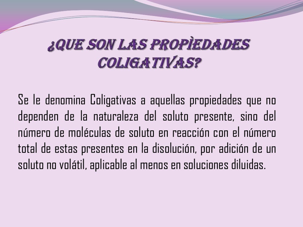 Definición, fórmulas, ejercicios. Las propiedades coligativas, son aquellas propiedades de las soluciones, que dependen, únicamente, de la cantidad de partículas de soluto presentes en la solución. El estudio de estas propiedades es fundamental en química analítica y tiene aplicaciones en otros campos de la ciencia y de la industria.
