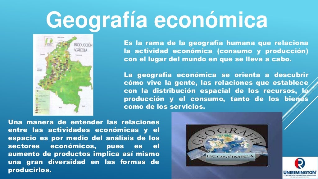 Geografía económica. La geografía económica es la rama de la geografía humana que relaciona y simpatiza la actividad económica ( consumo y producción) con el lugar del mundo en que se lleva a cabo. Los geógrafos se interesan no solo por dónde están las cosas sino por qué están situadas en donde se encuentran, y la naturaleza de los.
