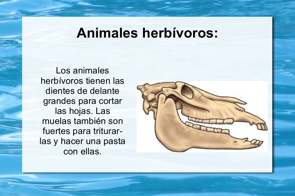 Los mamíferos se caracterizan porque sus mandíbulas albergan varios tipos de dientes. Aunque la forma y disposición de éstos varían en función de la nutrición de cada animal: herbívoros.
