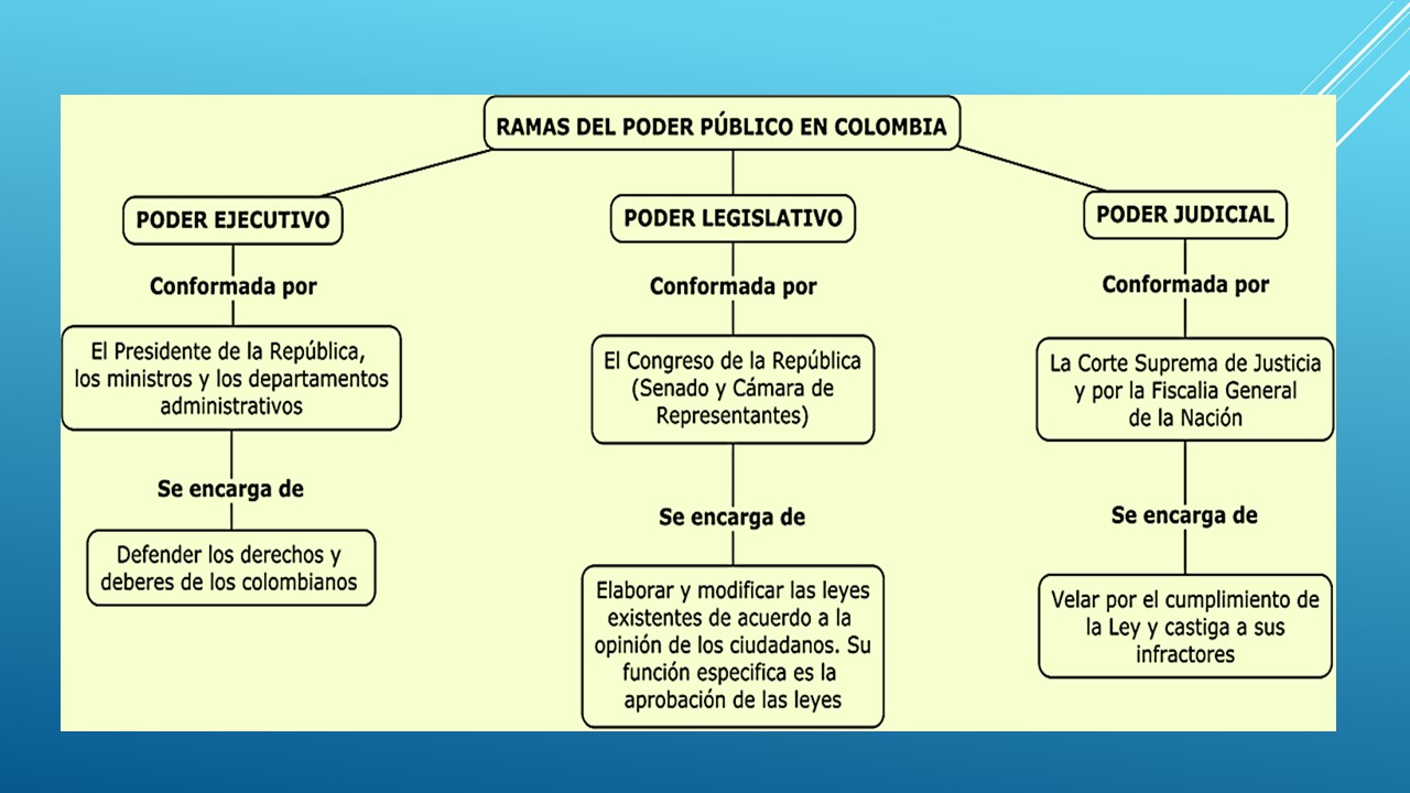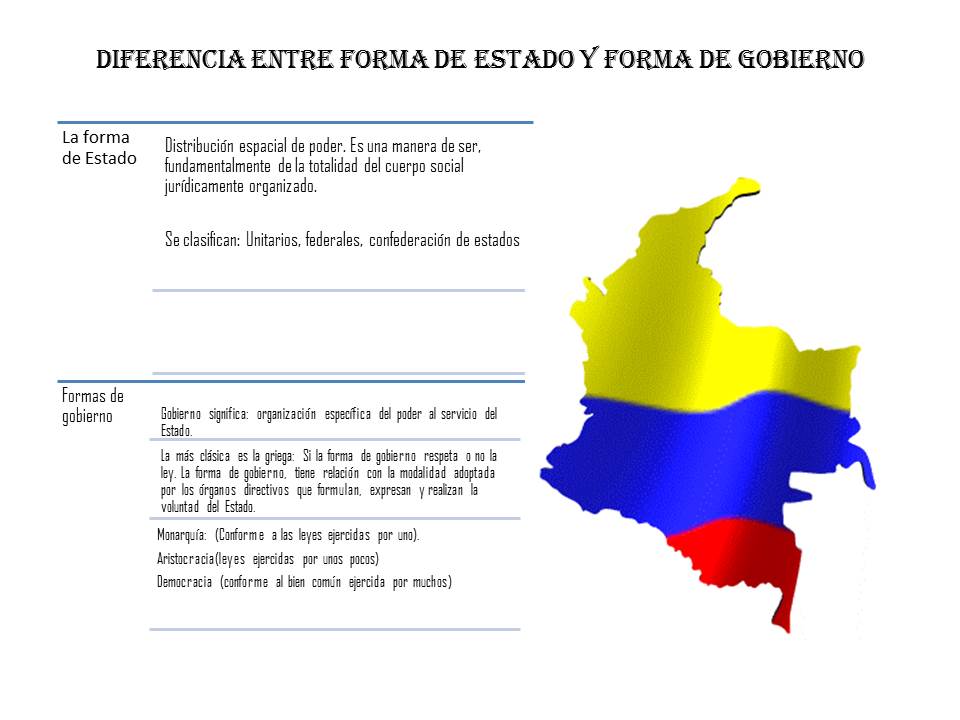 Colombia es un estado social de derecho, organizado en forma de república unitaria, con autonomía en sus entidades territoriales, Colombia tiene un sistema político republicano, democrático y representativo en la cual existe una clara división de poderes que son el ejecutivo, el legislativo, judicial.
